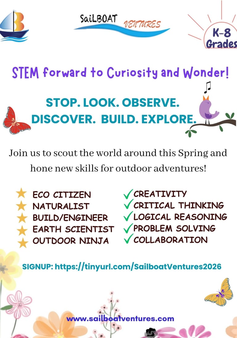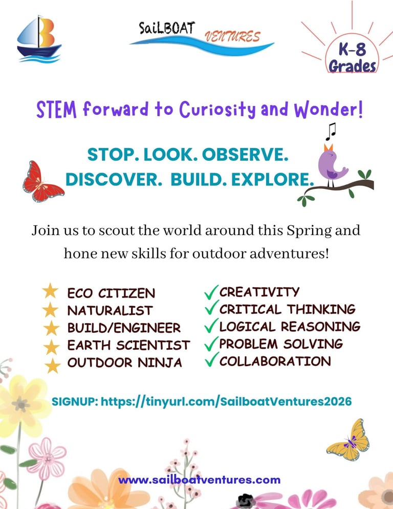 Spring is the time to venture outdoors & explore the world around us!! Signup NOW to explore our spring program. Join our fun immersive indoor/outdoor learning that includes hike/field trip along with cool STEM projects. Small groups & limited Spots ONLY !!